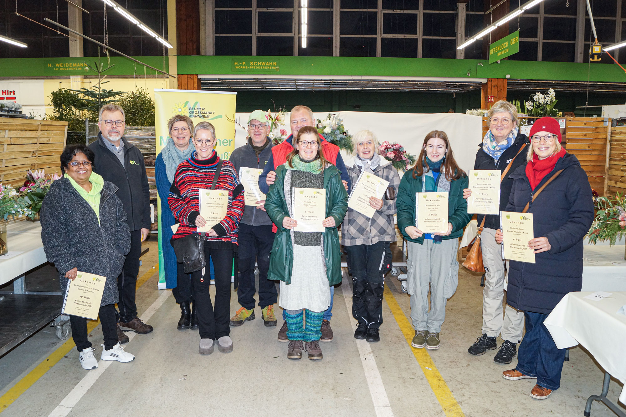 Am 16.11.25 fand im Blumengroßmarkt in Mannheim im Rahmen der Adventsbörse ein Adventsstraußwettbewerb statt. Die Wettbewerbs-Teilnehmer hatten die Aufgabe, einen Blumenstrauß zum Endverkaufspreis von 75,00 €, der als Geschenk zum 1. Advent überreicht werden soll, zu fertigen. Von Sonntag bis Dienstag hatten die Besucher des Blumengroßmarktes Gelegenheit, unter den 22 eingereichten Adventssträußen den Blumenstrauß auszuwählen, der die vorgegebenen Bewertungskriterien wie Verarbeitung, Haltbarkeit, Preis-Leistungs-Verhältnis am ehesten erfüllte.